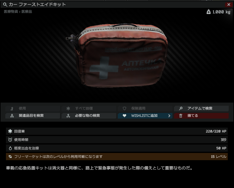 ■ Car First Aid Kit: 主に体力の回復や軽度出血を治療することが出来る